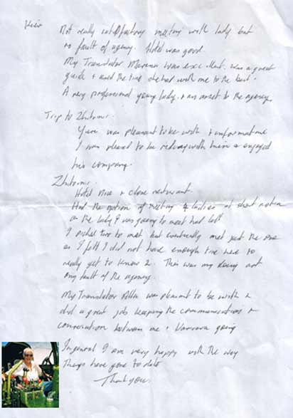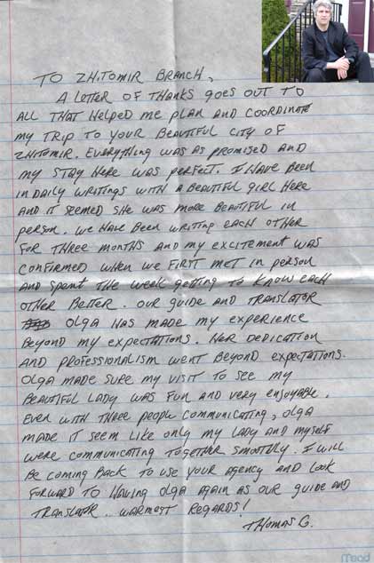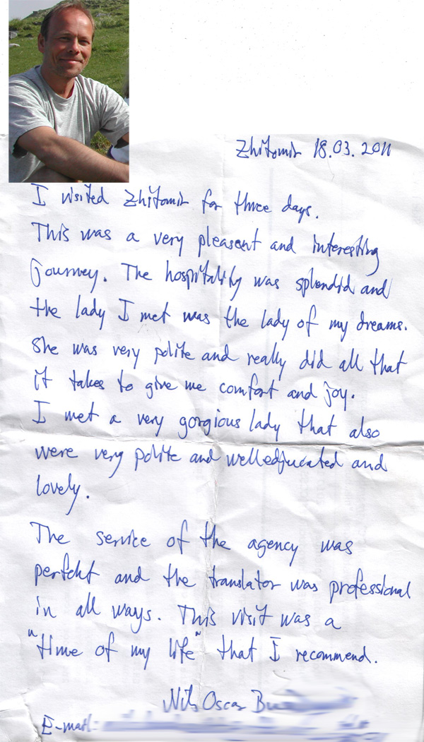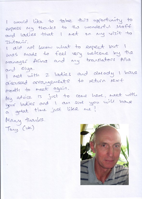 It was very nice to meet you and your staff recently when I came to Zhytomyr to meet Tanya. I enjoyed the