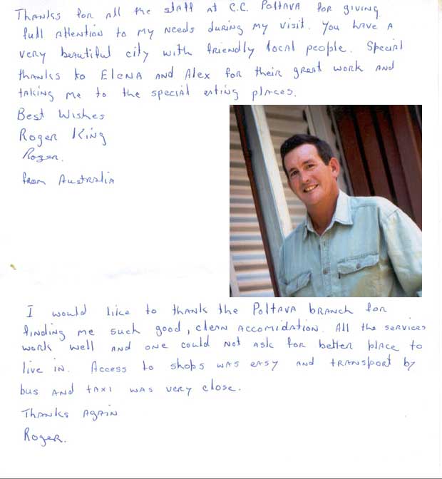 To all the staff.??I just wanted to send you a short letter to say thanks for introduction me to women that I would have never even thought of approaching. I wish I`ve net the woman of my dreams. Now all I have to do is choose one out of the 4 to complete that dream. Tell Ramadan "you Party animal! , I`ve never had so much fun going out for a night in a town, I think he knows more women then you guys I`ll let you know when I`m coming back to Kharkov and who`s the lucky one.