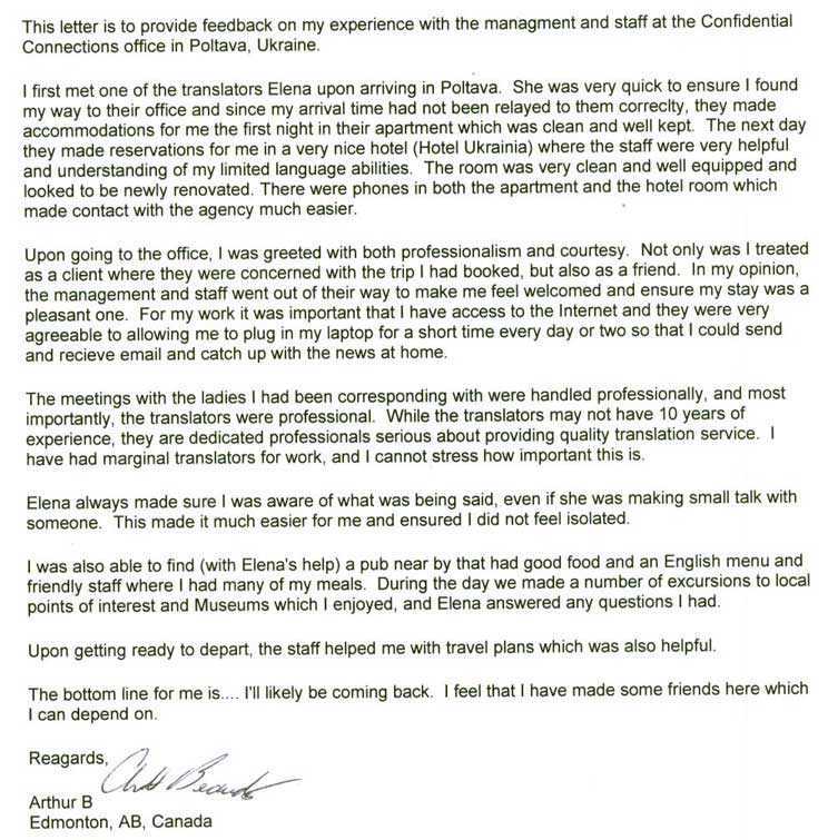 I have been a client of many dating agencies and I can say without any doubt I have found that Confidencial Connections to be far the best. Your people in Lugansk are very honest and friendly.