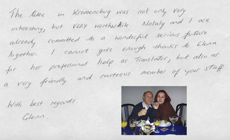 Through your efforts, you booked me into one of the best hotels in Kharkov (Hotel Kharkov). Contrary, to reports of substandard conditions in the hotels there, I never experienced a moment of discomfort. I was extremely well cared for by the Hotel staff and couldn't have asked for more. Of course, your Kharkov staff made every effort, as I mentioned above, to make sure that I was well cared for and shown the utmost respect throughout the two weeks that I stayed there. I'd be remiss if I didn't mention my tour guide and interpreter for the time that I was there. She was waiting for me upon arrival at the airport in Kharkov. Accompanied me on many of my activities while I was there and provided the window of communication that I sorely needed. She was also there to teach me about the Ukrainian culture. And, was the one who introduced me to a very special lady, of whom I will speak more of in a moment. She was also there at the airport upon my departure along with, your co-owner Viktor and agency Director Pasha and other staff members. Quite a send off. I felt like I was leaving my family. Again, thank you all for a wonderful time.